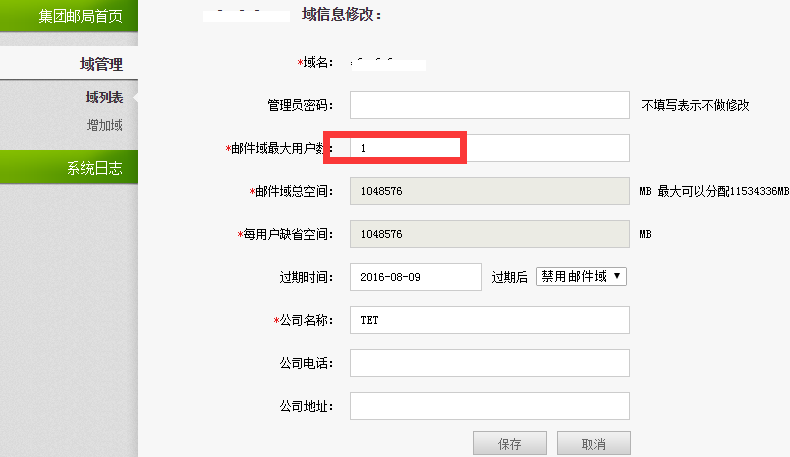 4. 调整编辑 邮件域最大用户数 ,单击 保存 按钮,即可成功对邮箱域可分配账号数增加。