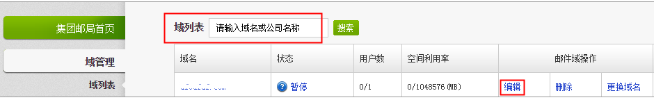 3. 在 域列表 中,通过搜索找到需要编辑的邮箱域信息,单击 编辑 按钮。
